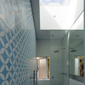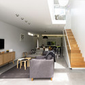 Serviços localizados no interior do pavimento semi subterrâneo posteior possibilitam conexões diretas entre a área de estar e o jardim com seu jacarandá, enquanto o pavimento térreo acima abriga um banheiro, o dormitório principal e outro adaptável, proporcionando flexibilidade para o uso futuro como escritório. A localização das janelas melhora a entrada de luz natural e promove ventilação, auxiliada por ventiladores de teto e um sistema de exaustão na cobertura, para retirar o calor retido do espaço original do telhado.