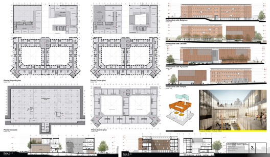 O novo edifício resgata a ideia inicial dos espaços intersticiais o os reproduz gerando as expansões em terraço em cada pavimento para oficinas culturais, criando interessantes perspectivas e reforçando a vitalidade destes espaços. Os espaços urbanos caracterizam-se por ser uma continuação das atividades propostas no interior. Propõe-se a criação de recintos particulares e característicos em cada quadra.