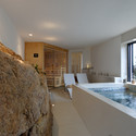 Desde o exterior, o salão é vivido com maior intensidade. A grande rocha serve de trânsito entre o local de permanência e a piscina com orientação sul e oeste, a mais propícia para o máximo desfrute. Com orientação sul, o nível inferior da habitação adapta-se a inclinação do terreno. Por outro lado, o nível superior parece flutuar sobre ela. Uma das coisas mais gratificantes do projeto é observar como a arquitetura foi pensada, estudada e refletida. Entusiasma a quem a experimenta, a vive e visita. Produz sensações que não te deixam indiferente e que, em grande parte graças ao respeito que se teve pelo entorno, conseguiu-se uma arquitetura em harmonia com a natureza.