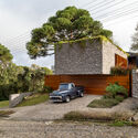 Descrição enviada pela equipe de projeto. Toda a volumetria da Casa RJ é moldada pelo concreto aparente paginado, que se prolonga até as lajes de cobertura do térreo, compondo um jogo preciso de linhas e furos já previstos desde a concretagem. Esse gesto construtivo não recebe revestimentos: o próprio concreto é acabamento definitivo, carregando a força da matéria em sua expressão mais pura.