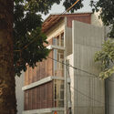 A casa é composta por dois núcleos verticais que ancoram extremidades opostas do terreno, conectados por uma laje de cobertura. Um núcleo facilita a circulação humana, enquanto o outro canaliza o fluxo de ar por meio de um tubo de concreto aberto que filtra a luz e conduz o ar através de um pátio semiexterior. Esses vazios verticais em camadas geram ventilação natural em todos os espaços de estar. A luz solar oeste é mitigada por fachadas com persianas e venezianas deslizantes, que podem se abrir amplamente nas horas mais frescas da manhã e da noite para criar ventilação cruzada. Embora o projeto não busque ser uma casa passiva termicamente ideal, procura oferecer uma solução regional para o conforto térmico em uma condição desafiadora: uma quadra urbana de alta densidade.