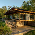 Descrição enviada pela equipe de projeto. A casa encontra-se situada na porção mais alta deste terreno de grande declividade, condição que favorece a iluminação e ventilação naturais e sublinha o grande mote do projeto: a integração dos espaços internos com a vista quase panorâmica do entorno.