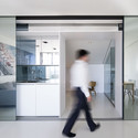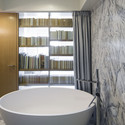 Nós aumentamos a janela da varanda, abrindo uma grande claraboia no sótão e derrubamos a parede entre a sala de estar e sótão. De repente, o apartamento sombrio foi inundado de luz desde o amanhecer até o pôr do sol. Queríamos que a luz da varanda e da claraboia alcançasse todos os espaços e assim, em vez de dividir a suíte com corredores e portas, posicionamos todos os espaços em uma seqüência linear, divididos por filtros ajustados para cada condição: vidro reflexivo, vidro transparente, cortinas translúcidas e cortinas black-out. Cada espaço tem a sua própria materialidade: piso sintético na sala de estar, mármore no banho turco e madeira na suíte.