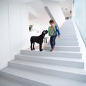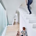 Uma escadaria ladeada por perfis de vidro desliza através dos três níveis da casa, proporcionando uma experiência espacial contínua e luz abundante, sem vista direta para dentro.