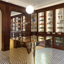 O interior da loja pré-existente era constituído por dois espaços a cotas diferentes, unidos por uma caixa de escadas, ambos com acesso direto ao exterior a partir de ruas diferentes. O espaço com entrada pela Rua da Misericórdia foi, durante anos, ocupado por uma farmácia, da qual herdou as paredes revestidas com vitrinas de madeira e o tecto de estuque branco com motivos geométricos e vegetais. A proposta para este espaço baseou-se sobretudo na preservação e restauro das estruturas existentes, de modo valorizar a pré-existência e adaptá-la às novas circunstâncias. No centro da sala, uma única peça caracteriza a intervenção e define o espaço: um balcão em latão polido que reflete a envolvente, permitindo uma circulação fluida e um uso livre do espaço.