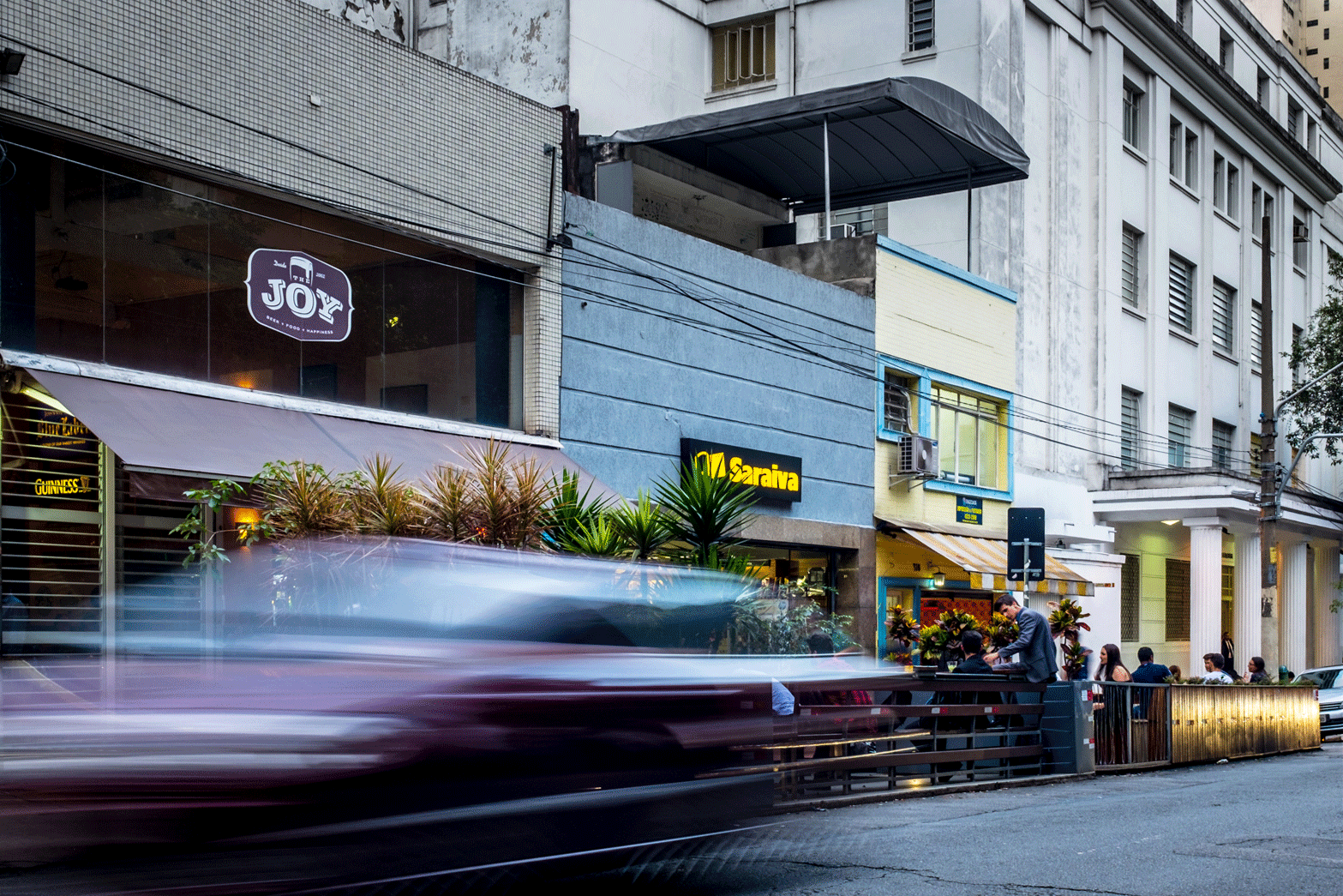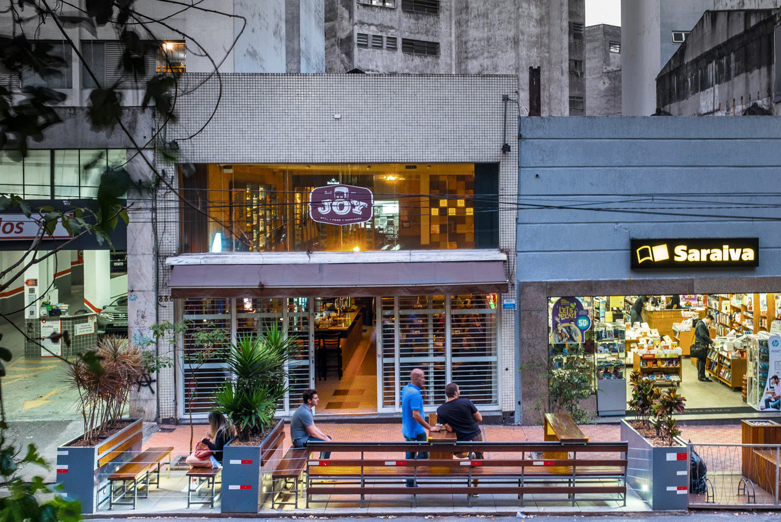 Em meio à movimentação da Rua Maria Antônia, conhecida principalmente pela grande ocupação universitária, o Parklet The Joy compõe esse cenário dando maior visibilidade e relevância para a permanência dos pedestres, em detrimento ao estacionamento de carros na rua.