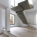 A escada de concreto aparente é a protagonista fundamental desta casa já que funciona como eixo de comunicação vertical e como potente pólo de atração visual desde a entrada, sala e cozinha. Além disso, distribui os espaços e exagera o desnível próprio do terreno.