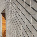 O partido em V da casa gera uma fachada principal diagonal em relação ao terreno. Os arquitetos valorizaram esta fachada através do uso de ladrilhos hidráulicos em relevo criados para este projeto, que destacam a variação de incidência solar sobre a mesma, criando uma fachada rústica, enquanto contemporânea em sua geometria.
