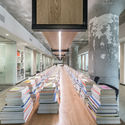 Ao longo do átrio central, um volume multifacetado de madeira articula as funções semi-públicas e privadas organizado os acessos e direcionando os fluxos no interior do edifício. Além de ser a porta de entrada da instituição, este elemento também é responsável por abrigar os espaços de armazenamento, coleta e retirada de livros, além de ocultar uma série de elementos construtivos indesejados do antigo armazém. Este elemento contínuo, o qual conduz os visitantes através do edifício ao mesmo tempo que oculta uma área de armazenamento e se transforma no mobiliário da sala de treinamento, organiza os fluxos através das suas portas de madeira embutidas e painéis fixos. Em meio ao escritório do pessoal, uma grande mesa pode ser utilizada para trabalhos em equipe, organização e preparação de materiais. Esses elementos de madeira atuam como articuladores dos espaços, conectando os diferentes programas e direcionando os fluxos ao longo do edifício.