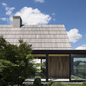 Tal como acontece com as fazendas, uma paleta limitada de materiais e detalhes unifica os vários espaços e responde ao clima local. Telhas de cedro comuns em edificações locais são adaptadas ao tamanho das tábuas para cobrir o telhado e as paredes laterais. As telas de cedro fornecem privacidade e filtram a luz. Uma base de pedra calcária eleva a casa acima da várzea, ao mesmo tempo em que cria poços secos para a drenagem de águas pluviais. Pisos de carvalho e carpintaria unificam os espaços.