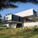 Adjacente aos vizinhos estão os dois principais volumes da casa, sobrepostos uns sobre os outros de forma perpendicular, gerando uma galeria. A composição da casa aproveita o desnível natural do terreno para acomodar as garagens na fachada principal e assenta o piso térreo no ponto mais alto do terreno. O acesso principal acompanha a encosta e nos leva à galeria, que distribui para a sala de jantar, dormitório de hóspedes, cozinha e cozinha de serviço. Um segundo volume independente serve como um núcleo de serviço e abriga o banheiro da piscina, sauna e lavanderia. A piscina serve como o hall da entrada principal.