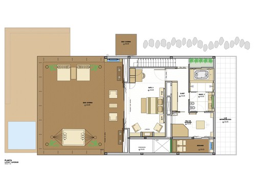 Todo pavimento superior possui o conforto do piso de carpete. Este pavimento priorizou o bem estar geral, abrangendo o dormitório master, bem espaçoso e aconchegante, todo revestido com painéis de madeira, cama com cabeceira alta revestida de camurça, bem como a presença de uma lareira. O banho máster é composto por uma grande banheira, jardim e sala de massagem com sauna seca.
